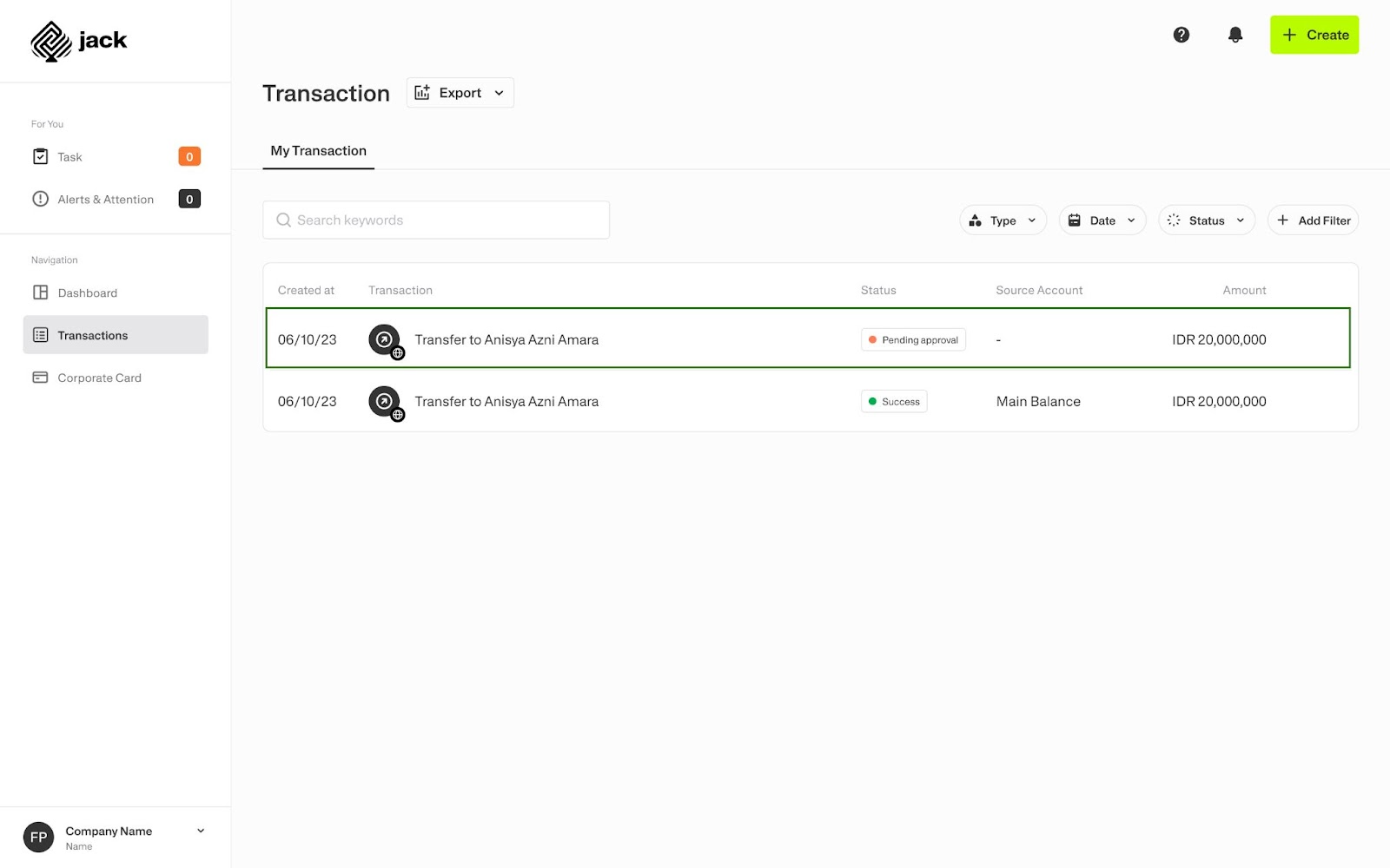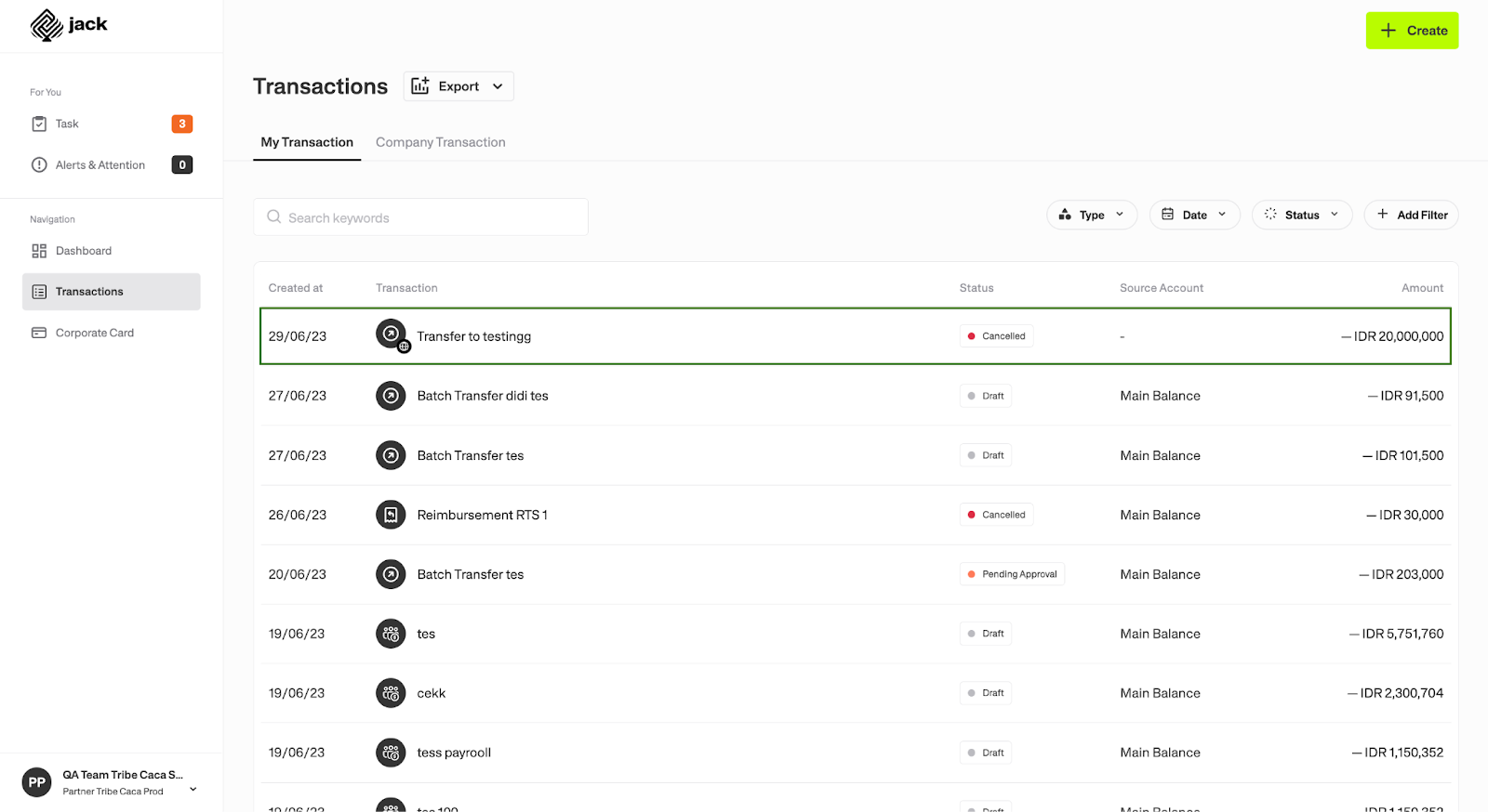 1. Di Portal Jack, klik Transaksi. Lalu, masuk ke tab Transaksi Saya untuk melihat daftar transaksi yang telah Anda buat. Pilih transaksi Transfer Internasional yang ingin Anda batalkan (Untuk memudahkan pencarian, gunakan filter: Transaksi  = Transfer Internasional).